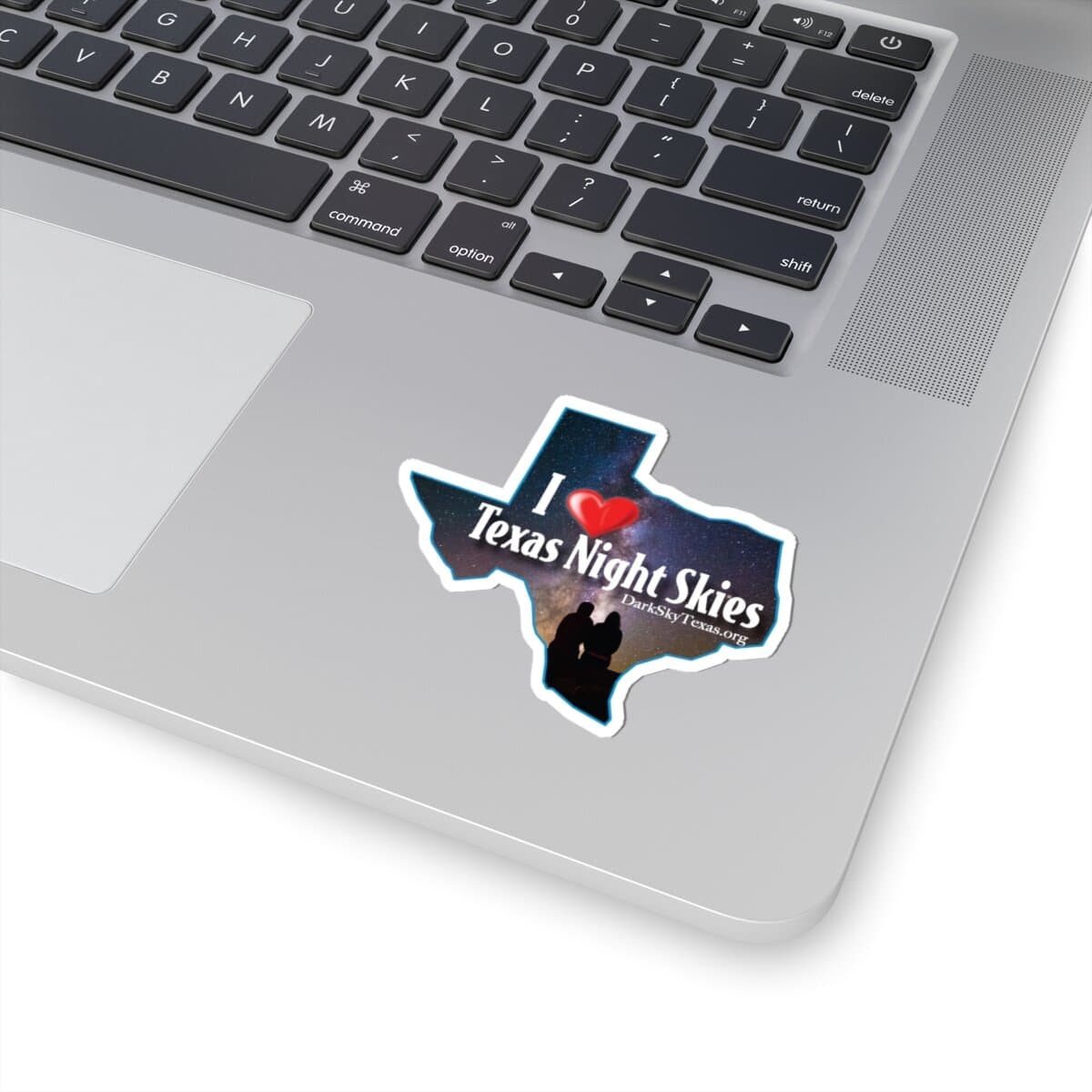 A glossy kiss-cut sticker shaped like the outline of Texas, filled with a starry night sky and a small silhouette of two stargazers. The design reads “I ♥ Texas Night Skies,” capturing the quiet wonder of an evening under the Milky Way. It’s made from durable vinyl with vibrant eco-solvent inks, offering bright, fade-resistant color and a scratch-resistant surface. The strong permanent adhesive lays flat and smooth on laptops, journals, water bottles, or any smooth, indoor surface, and the kiss-cut edge makes peeling and placement effortless. Choose white or transparent backing and from four sizes to suit your space and style.